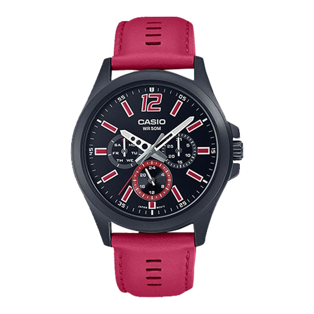 Casio WR-50M Men's Black Round Dial & Red Strap Chronograph Watch, MTP-E350BL-1BVDF
