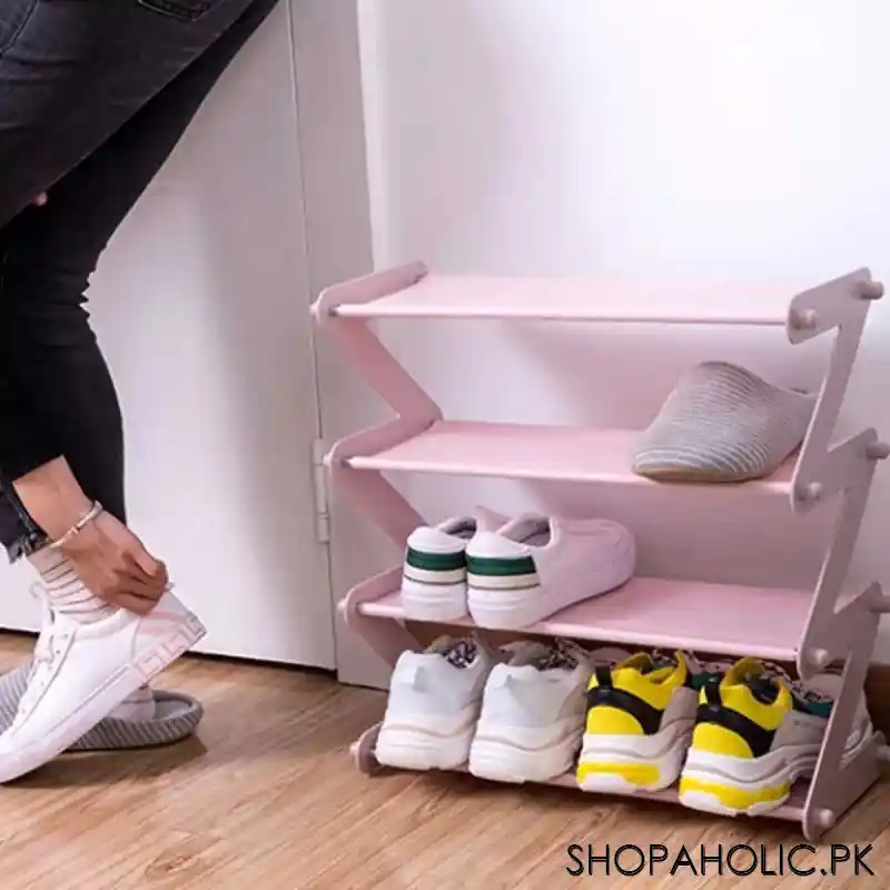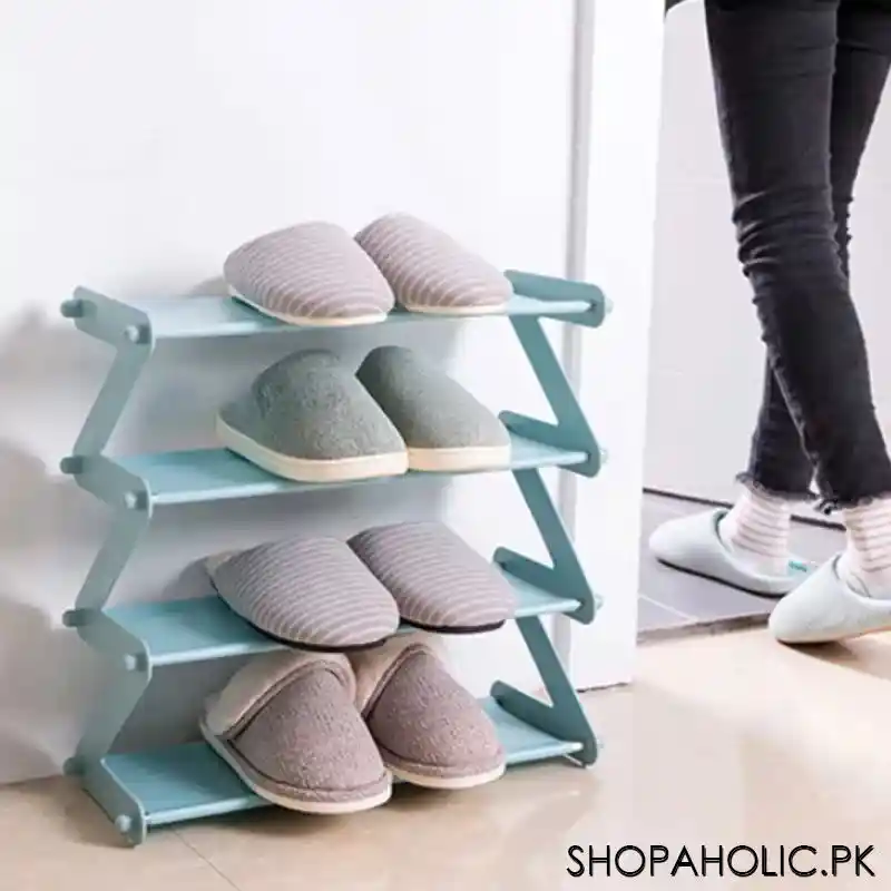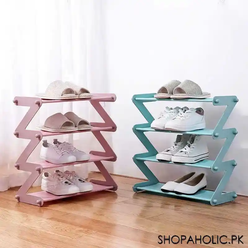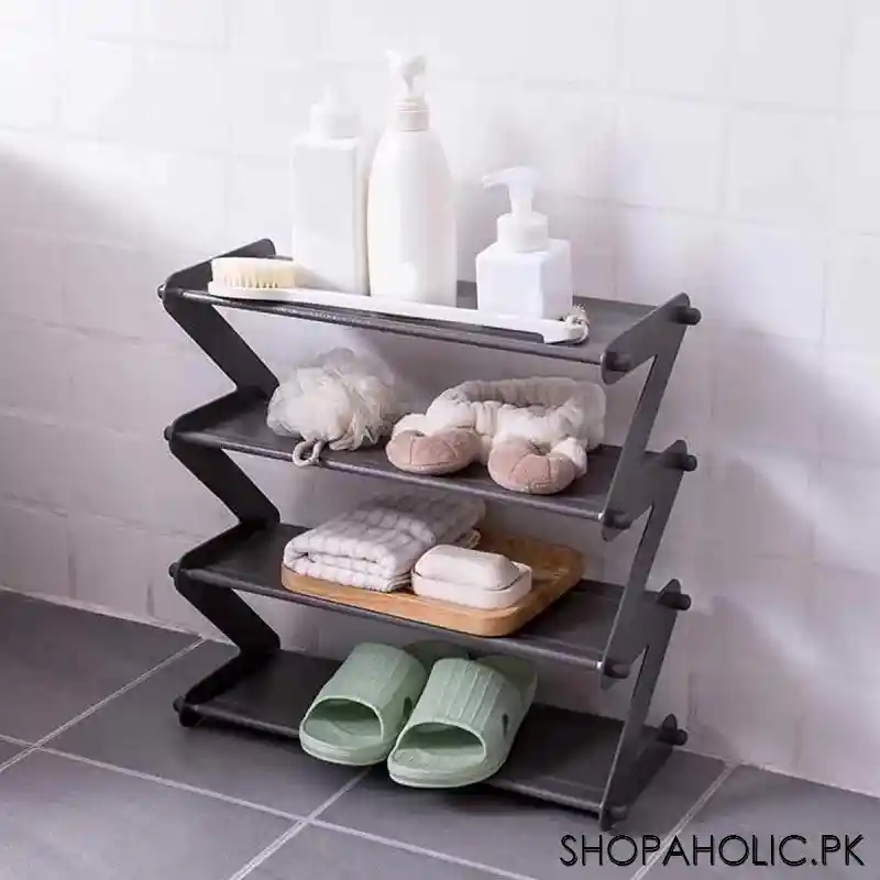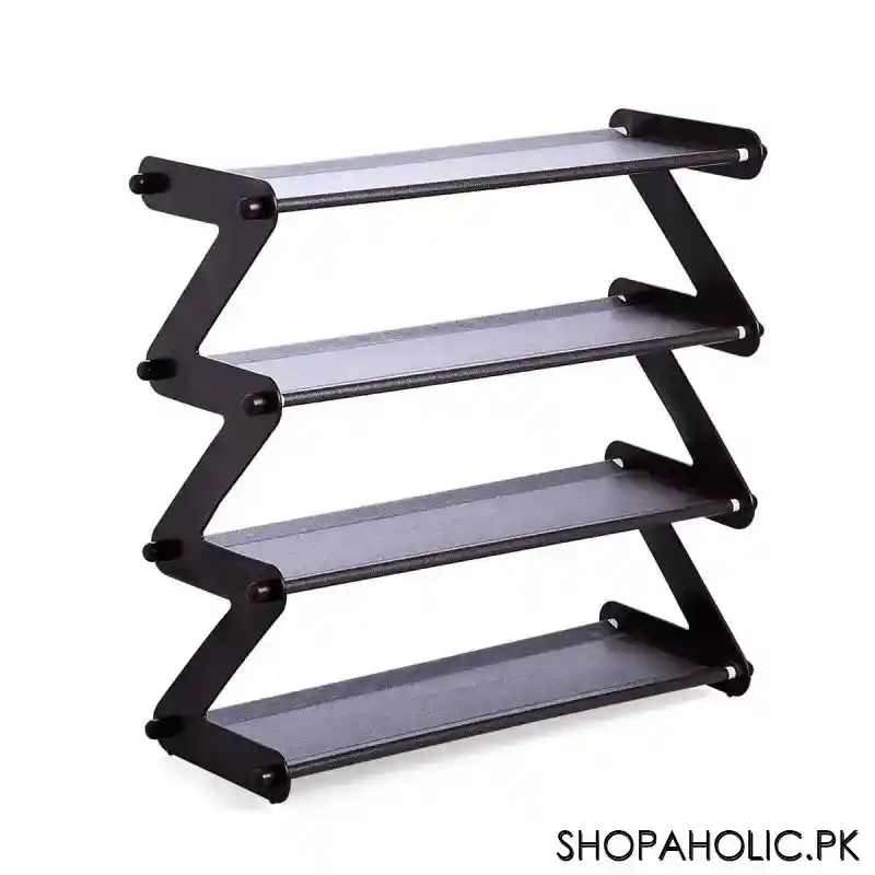 A 4-layer zigzag shoe rack standing organizer is a versatile piece of furniture designed to help you keep your shoes, books, and other small items organized and easily accessible. This product typically consists of a four-layered shelving unit with a zigzag design that adds a unique and modern touch to your living space.