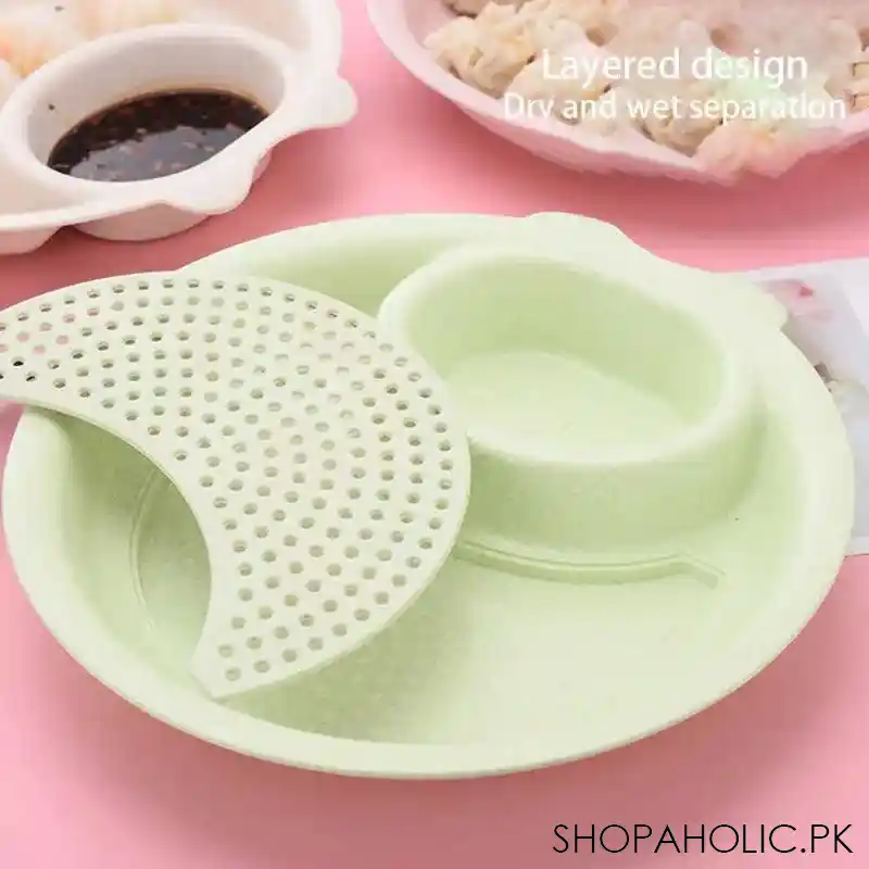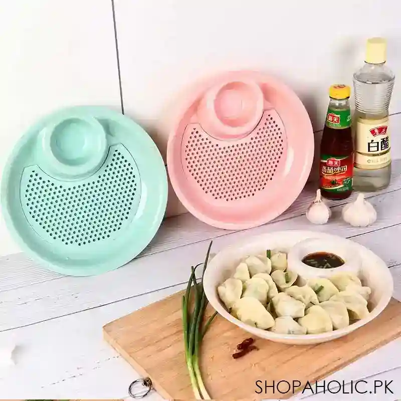 The dish features a vinegar saucer at one side, which is convenient for dipping dumplings or other food items. The drain part of the dish can be removed for easy cleaning and maintenance.