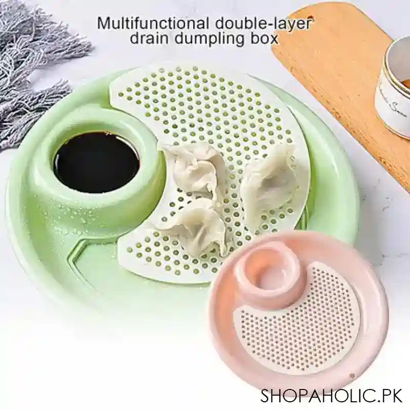 Introducing our double layer dumpling dish, now available on shopaholic.pk! Made with food-grade plastic material and featuring a non-slip design, this dish can be used as a normal dish or a draining dish. It also comes with a vinegar saucer at one side for added convenience. The drain part can be removed for easy cleaning, and the round shape with a sauce dish design adds an aesthetic touch. This dish is approximately 24cm/9.45 inches and is perfect for serving multiple portions of dumplings or other foods. Don't miss out on this versatile and practical addition to your kitchen!