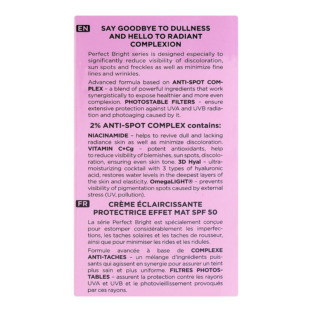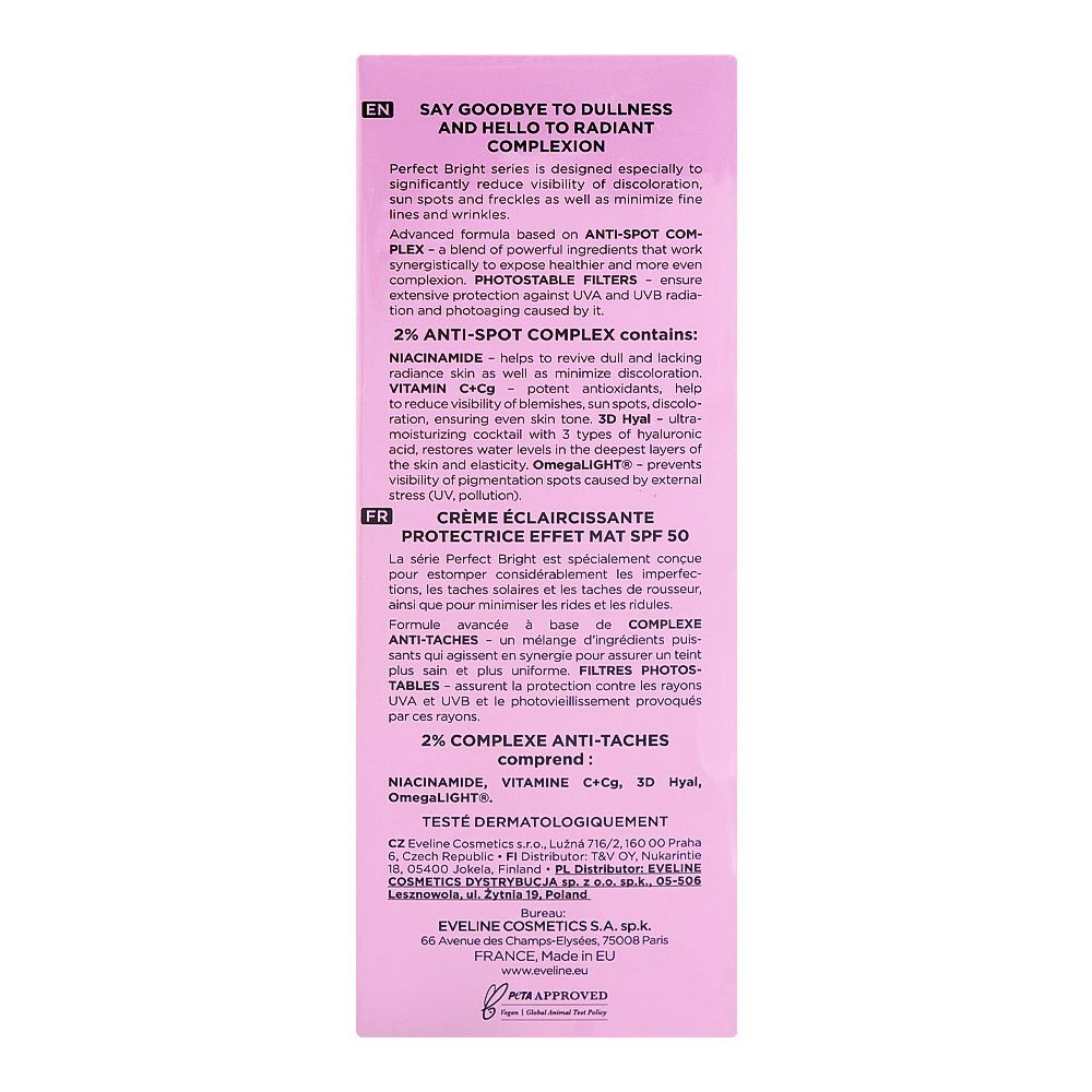 Eveline Brightening Protective Matt Day Cream SPF50, Anti Spots Sunscreen, For Even Toned Radiant Skin, 30ml