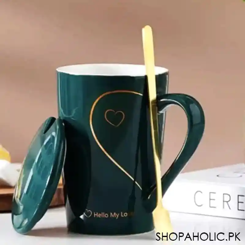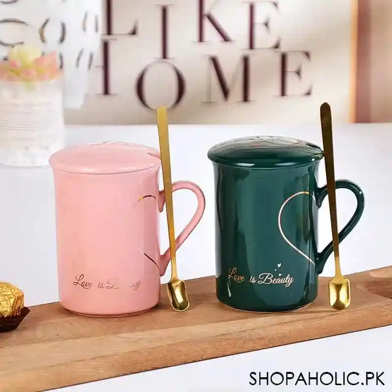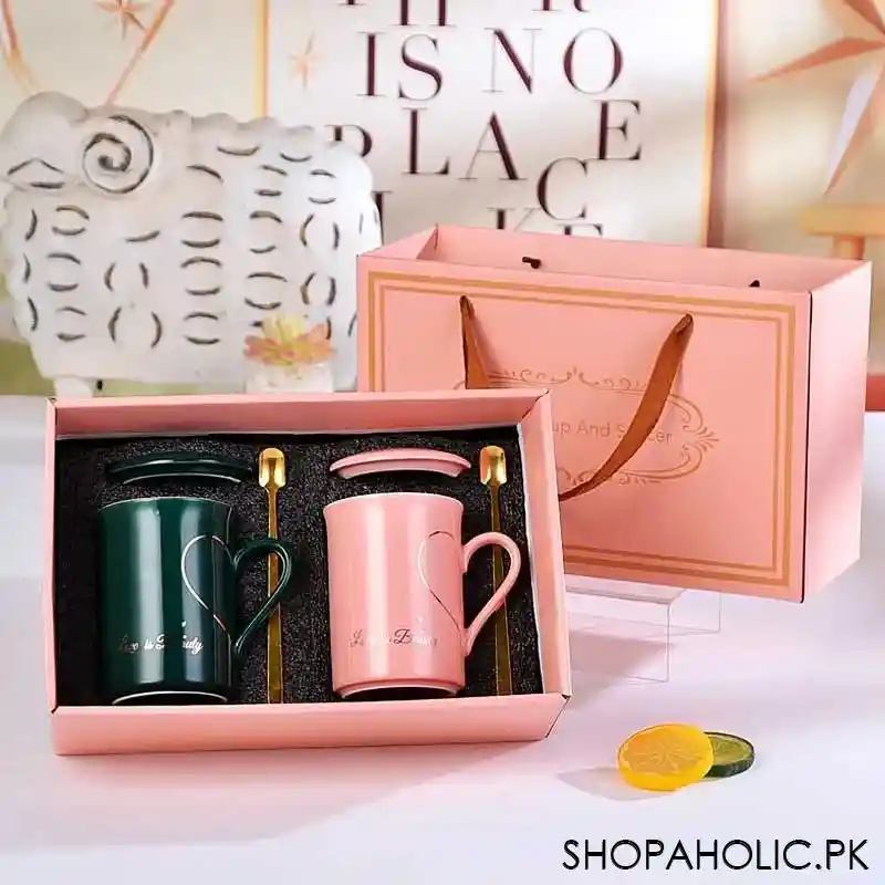 - Set of two heart-patterned ceramic mugs with lids and spoons