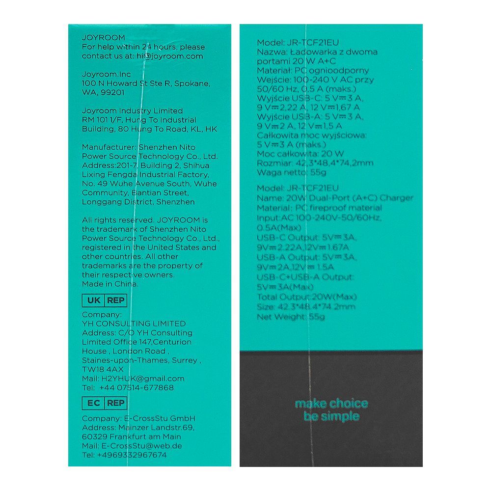 Joyroom 20W Dual Port (A+C) Wall Charger, White, JR-TCF21EU