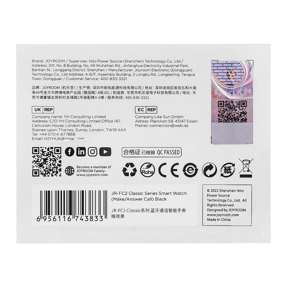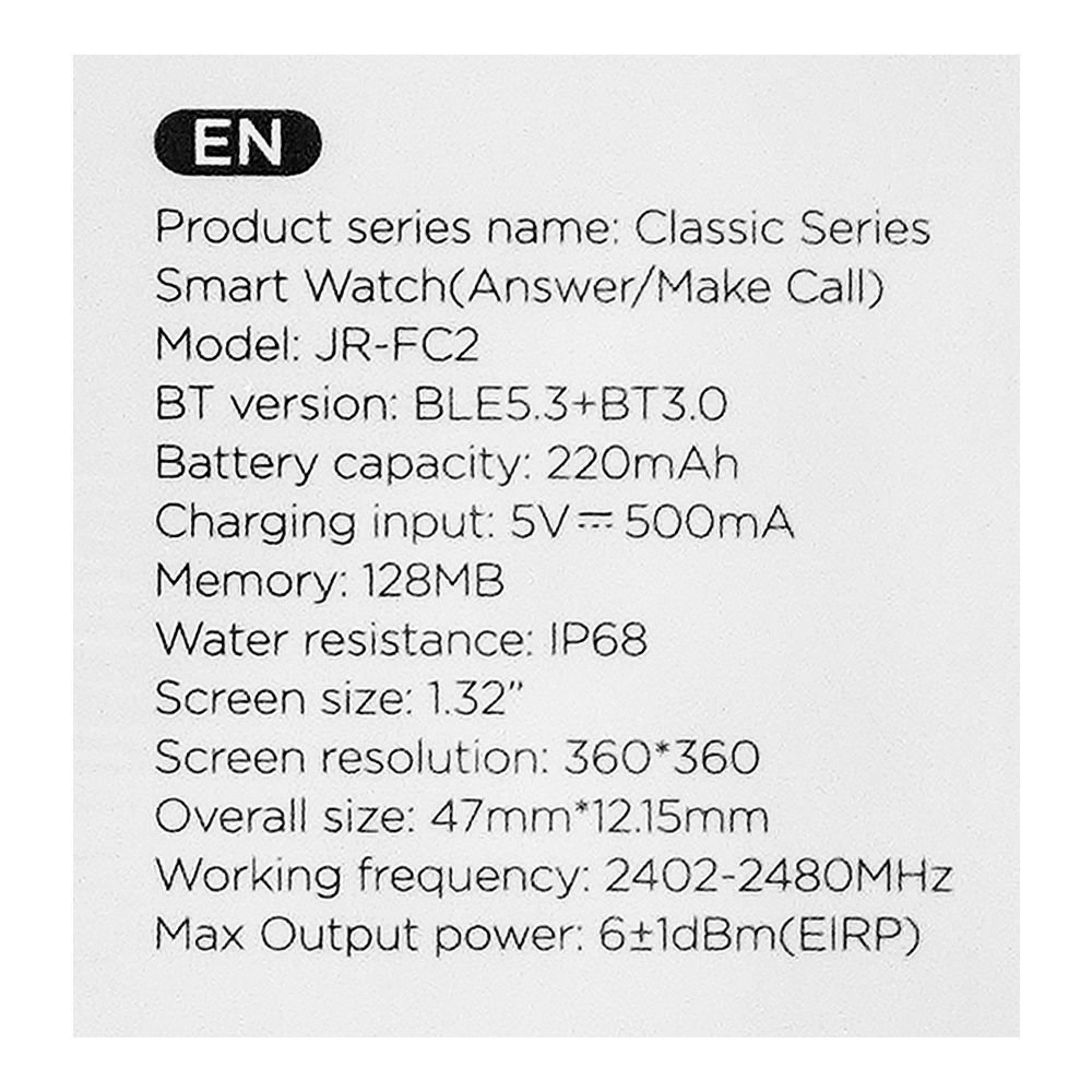 Joyroom Classic Series Make/Answer Call Men's Smart Watch, Black, JR-FC2