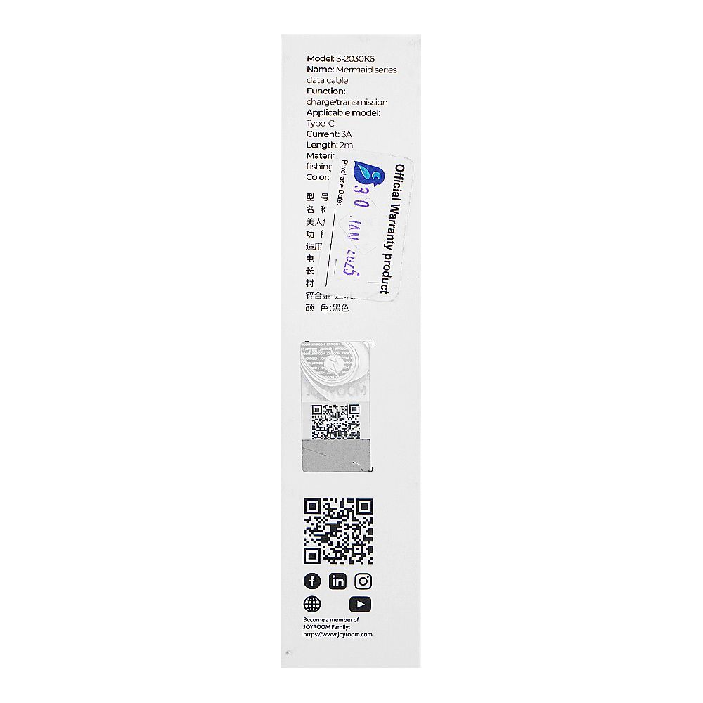 Joyroom Mermaid Series Type-C Fast Charging Data Cable (2m, 3A), Black, S-2030K6