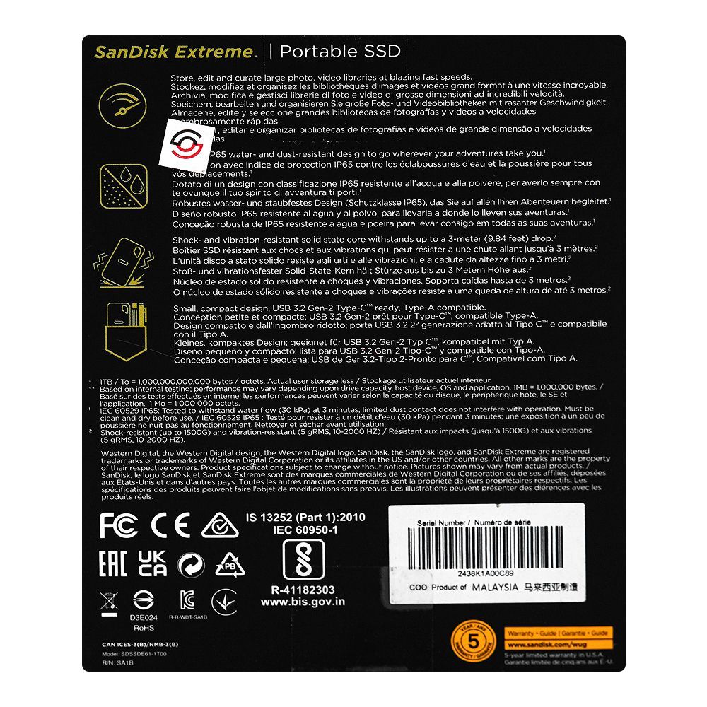SanDisk Extreme Portable SSD 1TB, Up to 1050MB/s, IP65 Water Resistance, SDSSDE61-1T00-G25