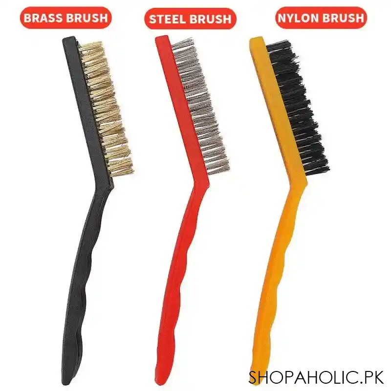 - This brush set is designed to effectively remove rust and clean different surfaces and includes three types of brushes made of stainless steel, brass, nylon, and wire.
