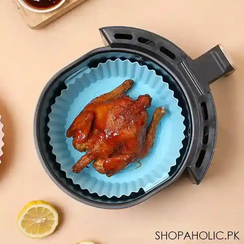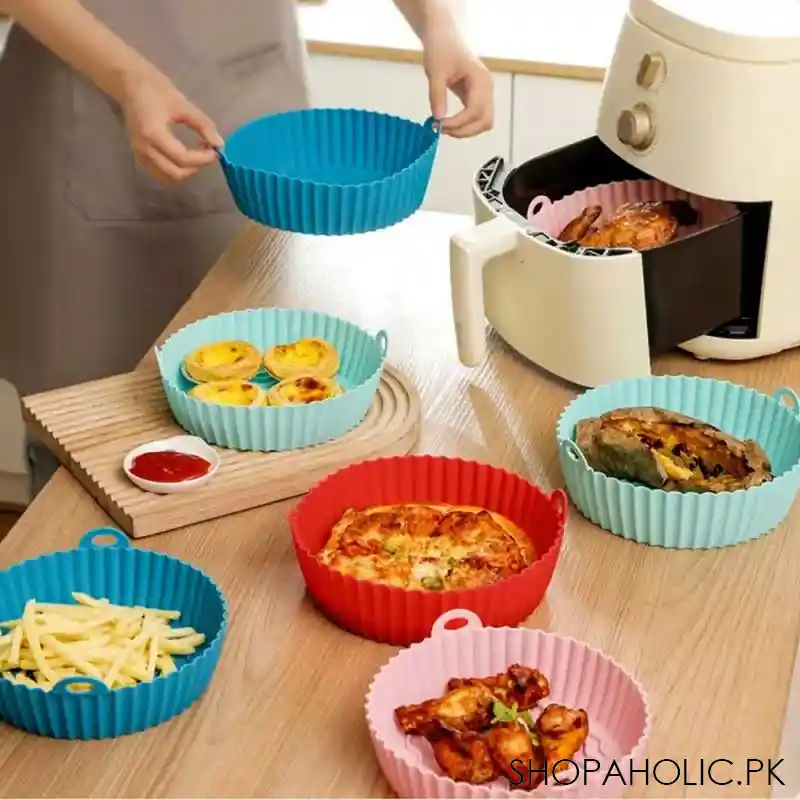 The tray is designed to fit inside the air fryer basket and comes in various sizes and shapes to fit different air fryer models. Its non-stick surface allows for easy food release and cleanup, while its heat-resistant properties allow it to withstand high temperatures, making it suitable for use in the oven, microwave, and freezer.