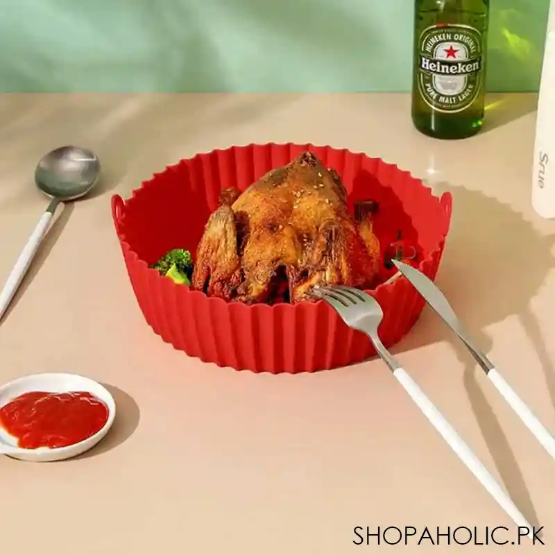 A silicone reusable air fryer baking tray is a versatile kitchen tool made of food-grade silicone that can be used to cook and bake food in an air fryer. It is designed to be reusable and eco-friendly and can be used for air frying, baking, roasting, and grilling. Its non-stick surface and heat-resistant properties make it a convenient tool for healthier cooking with little to no oil.
