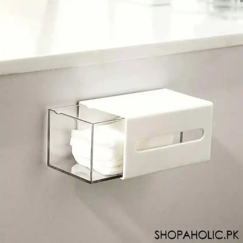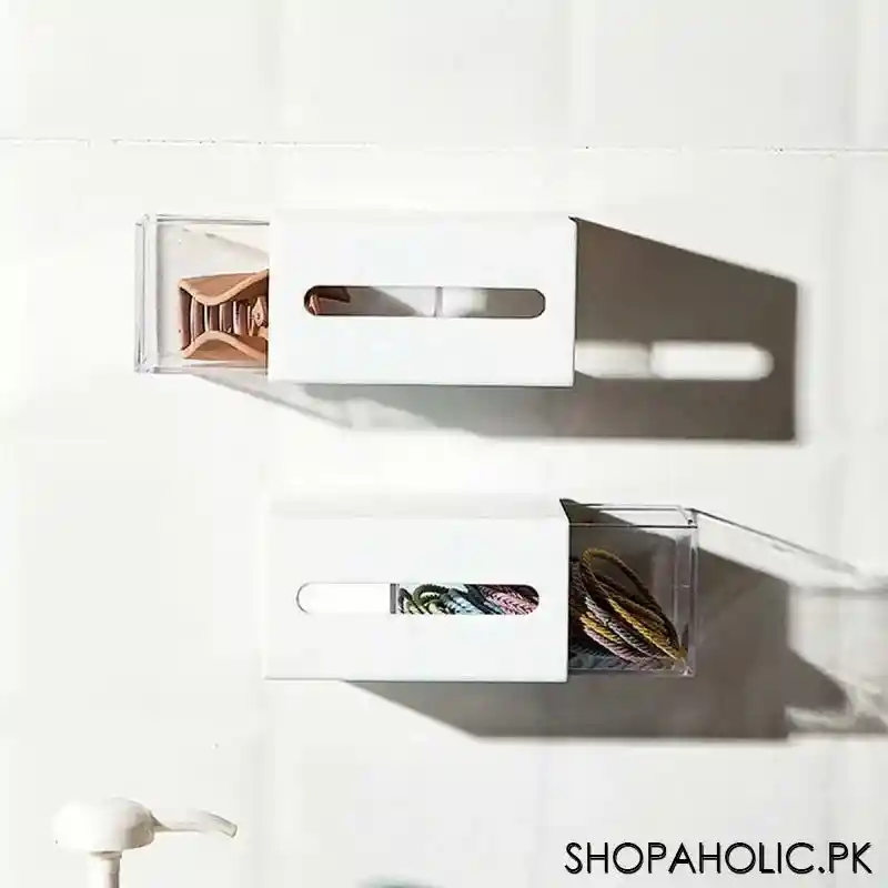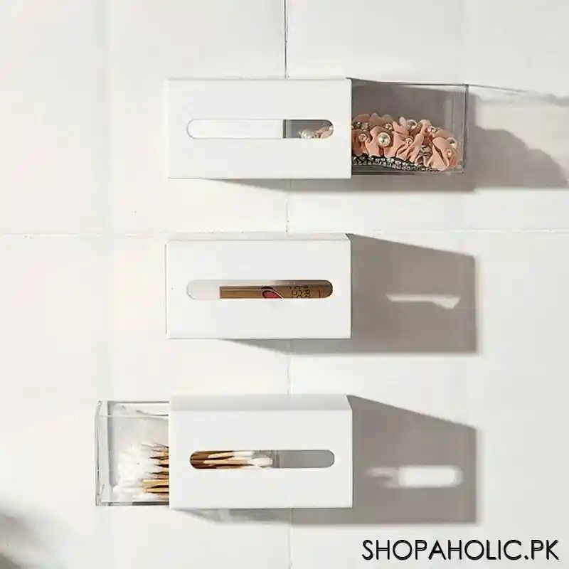 The wall-mounted stacking storage box is a small plastic container designed to attach to flat surfaces such as walls, mirrors, and tiles, using an adhesive backing. It is a versatile storage solution that can organize and store small items such as cosmetics, jewelry, and office supplies.