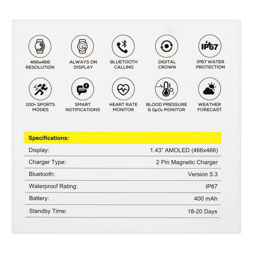 Yolo 1.43" Amoled Display Tag Smart Watch, IP67 Water Resistance, Silver
